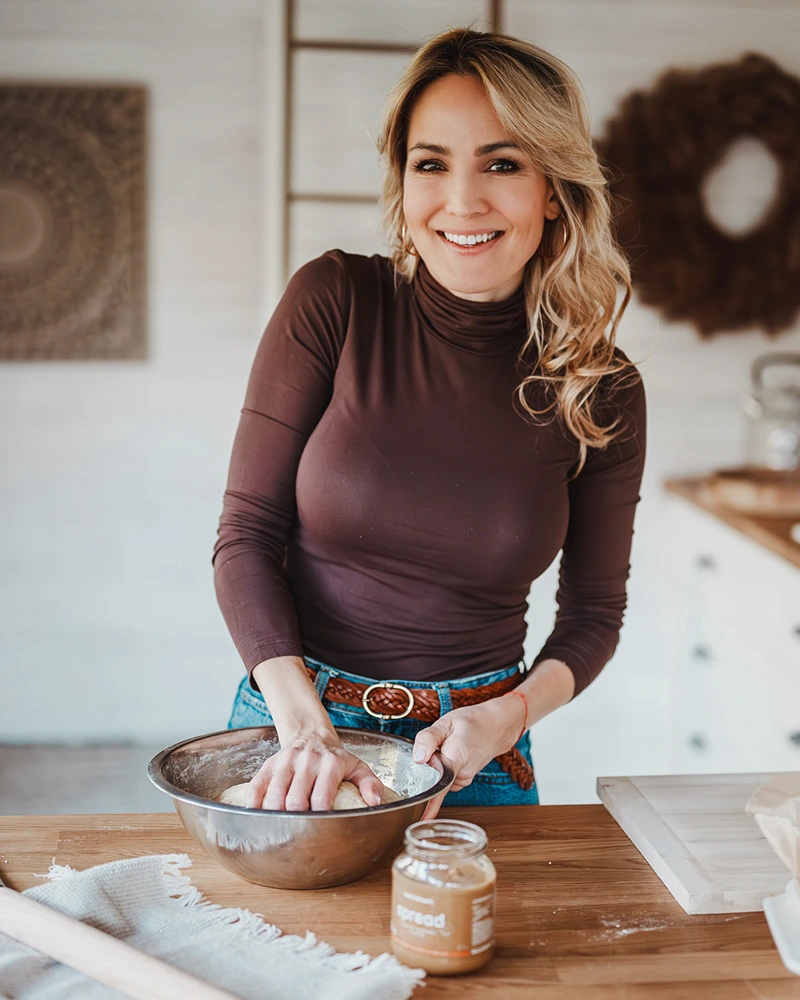 Anschliessend ausrollen, mit einer zuckerfreien Salzkaramellcreme bestreichen, aufrollen und in etwa 9 Scheiben schneiden.